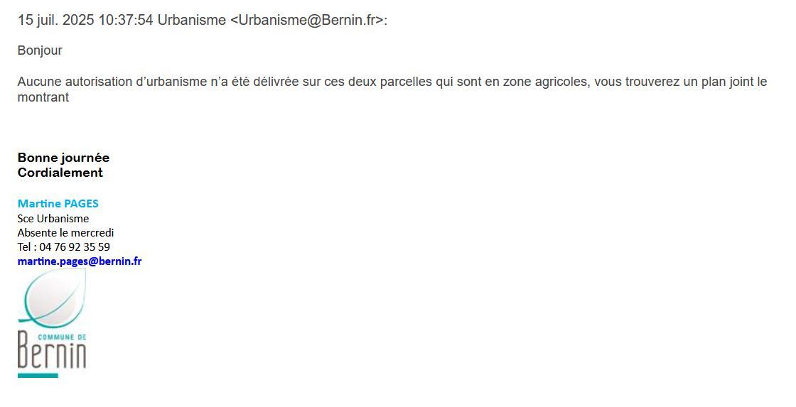 La commune de Bernin était donc elle aussi nécessairement informée de l’urbanisation de cette parcelle. Nous n’avons connaissance d’aucune procédure engagée par la commune pour régulariser la situation.