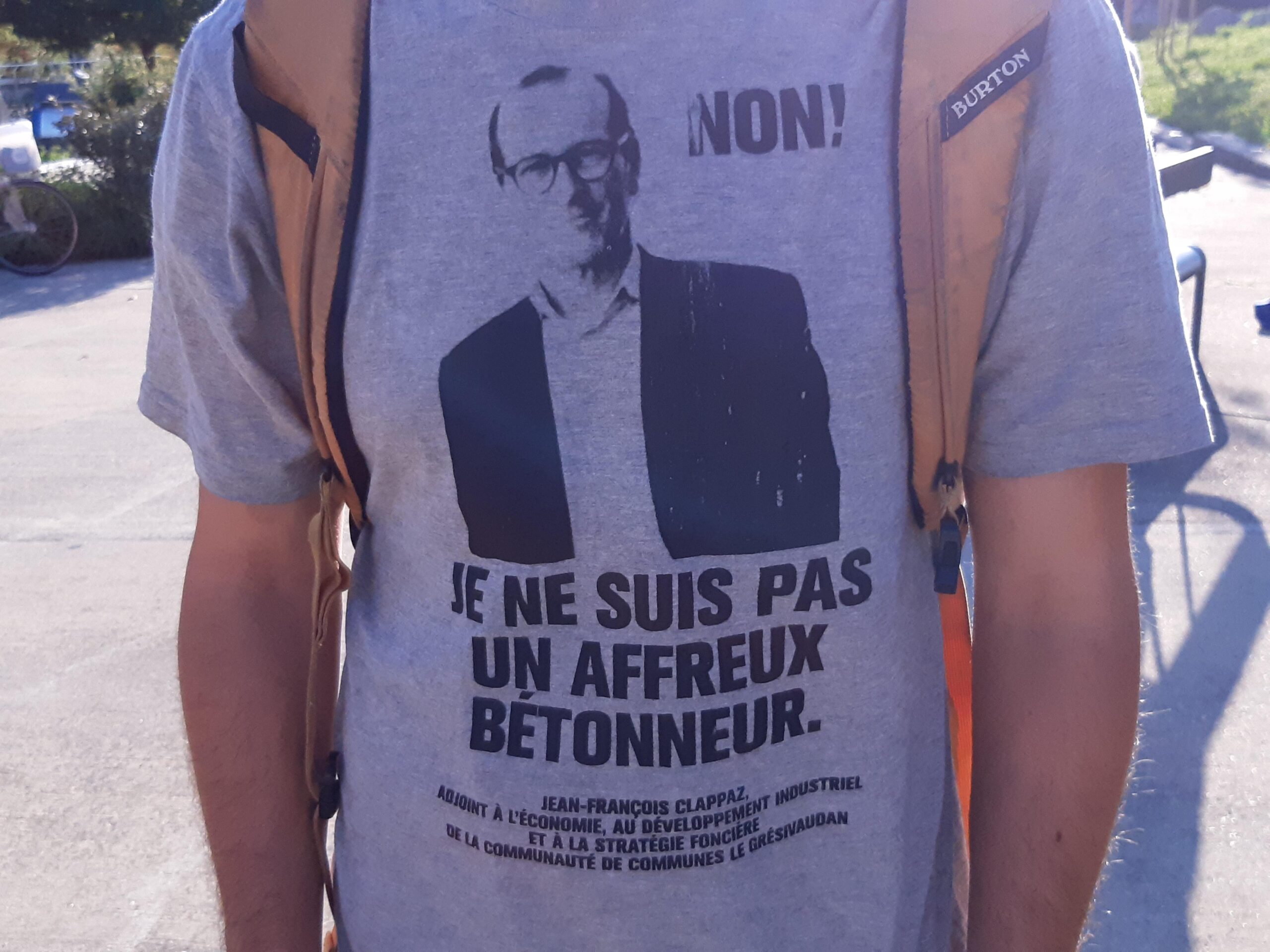 Nous avons remis à Henri Baile (président de la CCLG) et à Jean-François Clappaz (adjoint à l’économie, au développement industriel et à la stratégie foncière) des tee-shirts avec leurs photos sur lesquels étaient inscrits « Non ! Je ne suis pas un affreux bétonneur. » (en référence à une déclaration des élus reprise dans le Dauphiné Libéré). Pour mieux rendre hommage à ces deux élus, plusieurs personnes dans l’assemblée portaient des masques à leur effigie. Nous avons également remis la Truelle d’Or à Jean-François Clappaz pour l’ensemble de son œuvre de bétonisation du Grésivaudan (lire le portrait que Le Postillon lui consacrait).