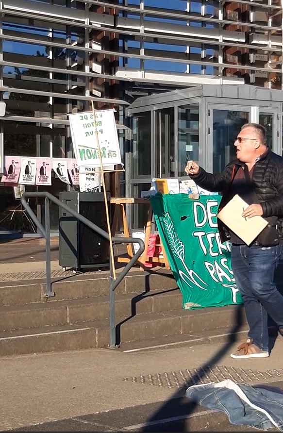 À peine arrivé devant notre rassemblement, ce conseiller communautaire s’est dirigé vers les personnes au micro et leur a violemment ôté leurs masques. L’ambiance s’est immédiatement tendue, les gendarmes accourant vivement pour calmer ses ardeurs, tandis que l’entourage de M. Pommelet essayait de le raisonner : « Tu déconnes, Serge, tu déconnes !».