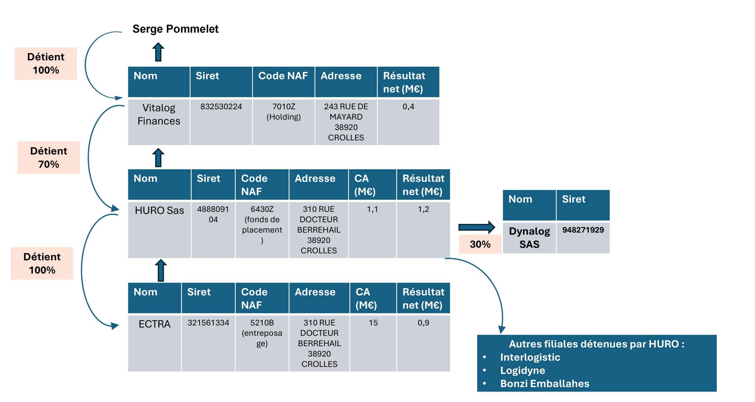 Toutes ces entreprises sont chapeautées par Huro SAS, un fond de placement domicilié à l’adresse d’Ectra, lui même détenu à 70 % par la maison-mère : Vitalog Finances, domiciliée elle à l’adresse de M. Pommelet.