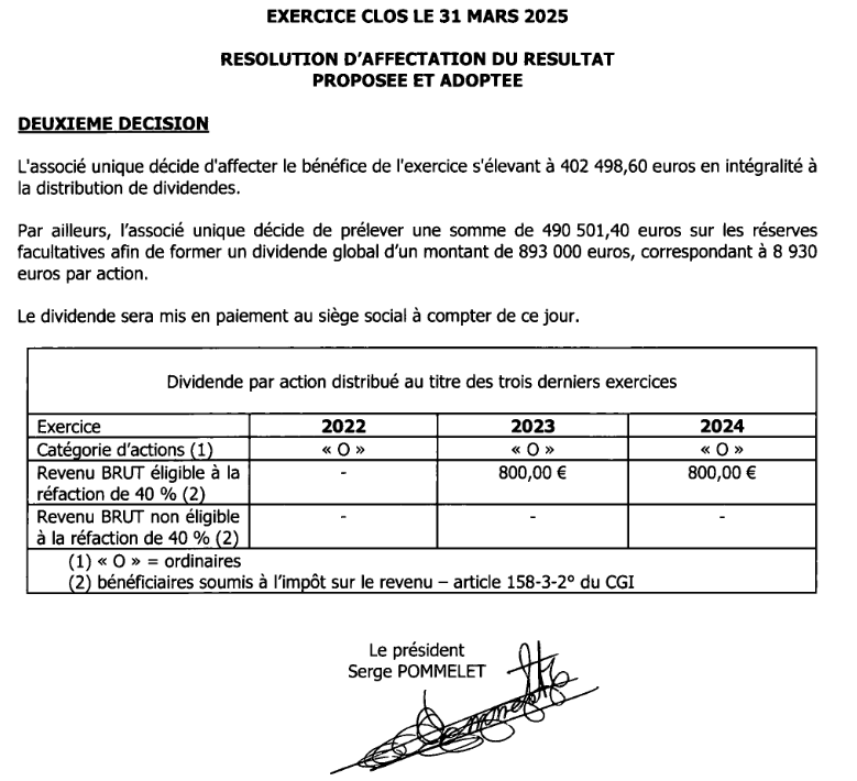 Concrètement, la majeure partie des bénéfices de ces entreprises remontent vers Vitalog. Pour cette dernière, les activités sont prospères : en 2025 Vitalog a reversé 893 000 € de dividendes aux actionnaires. Or, il se trouve que Vitalog a pour particularité d’être détenue par un actionnaire unique : Serge Pommelet . Ce dernier s’est donc versé le 30 septembre dernier ces copieux dividendes (qui s’ajoutent aux éventuels salaires perçus au titre de ses activités de dirigeant d’entreprises) et aux 80 000€ de dividendes versés en 2024, ainsi qu’aux 80 000€ de 202333.