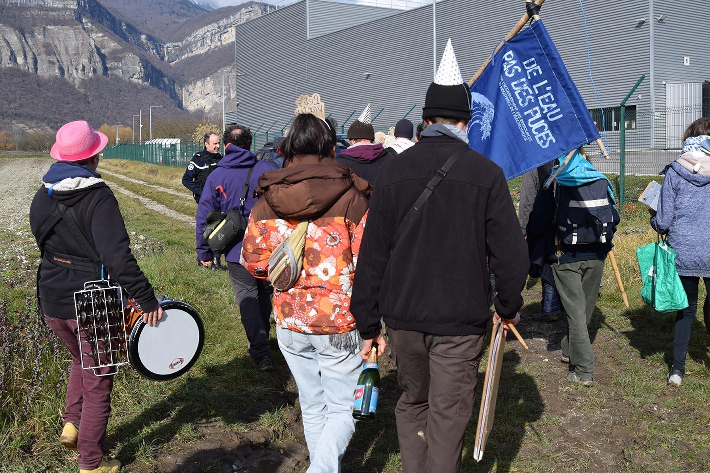 Nous avons sablé le champagne, déployé une banderole, et c’est au son des tambours de la Combatucada que nous avons rappelé à l’industriel notre intention d’empêcher l’agrandissement de la zone d’activités économiques (ZAE) des Fontaines. En effet, nous préférons 10 hectares de terres agricoles à 10h d’usines produisant des puces électroniques pour l’internet des objets, l’automobile, les smartphones et la dissuasion nucléaire.